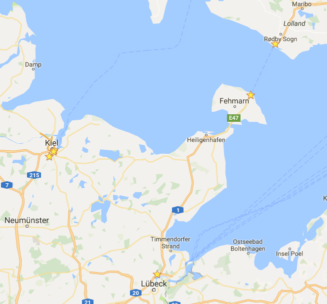 Von dort mit der Fähre (Vogelfluglinie) nach Rödby in Dänemark.